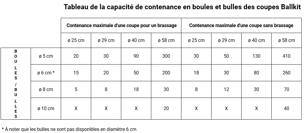 Petits ou grands événements, les produits BallKit sauront répondre à vos besoins. Les coupes transparentes sont disponibles en 25 cm, 29 cm, 40 cm et même 58 cm ! Quant aux bulles plastiques, nous vous conseillons d'opter pour les tailles 5 cm, 8 cm, 10 cm, 12 cm ou 25 cm. N'hésitez pas à vous référer à notre tableau pour connaitre la contenance des coupes plastiques transparentes selon leurs tailles !